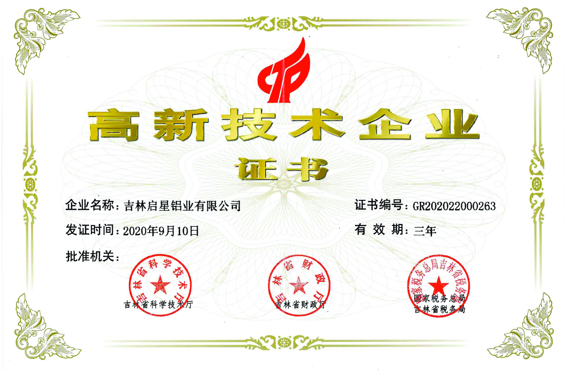 啟星鋁業(yè)獲得國家高新技術(shù)企業(yè)認定