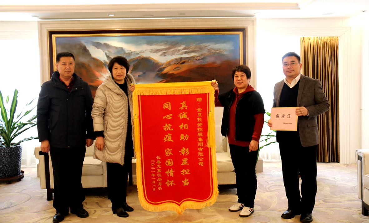 ?2月24日下午,長春海關(guān)王志娟副處長、龍嘉機場海關(guān)馮華副關(guān)長和王俊剛主任一行三人來到金豆投資控股集團,對金豆投資控股集團在新冠疫情防控期間捐贈防疫物資送來錦旗和感謝信。